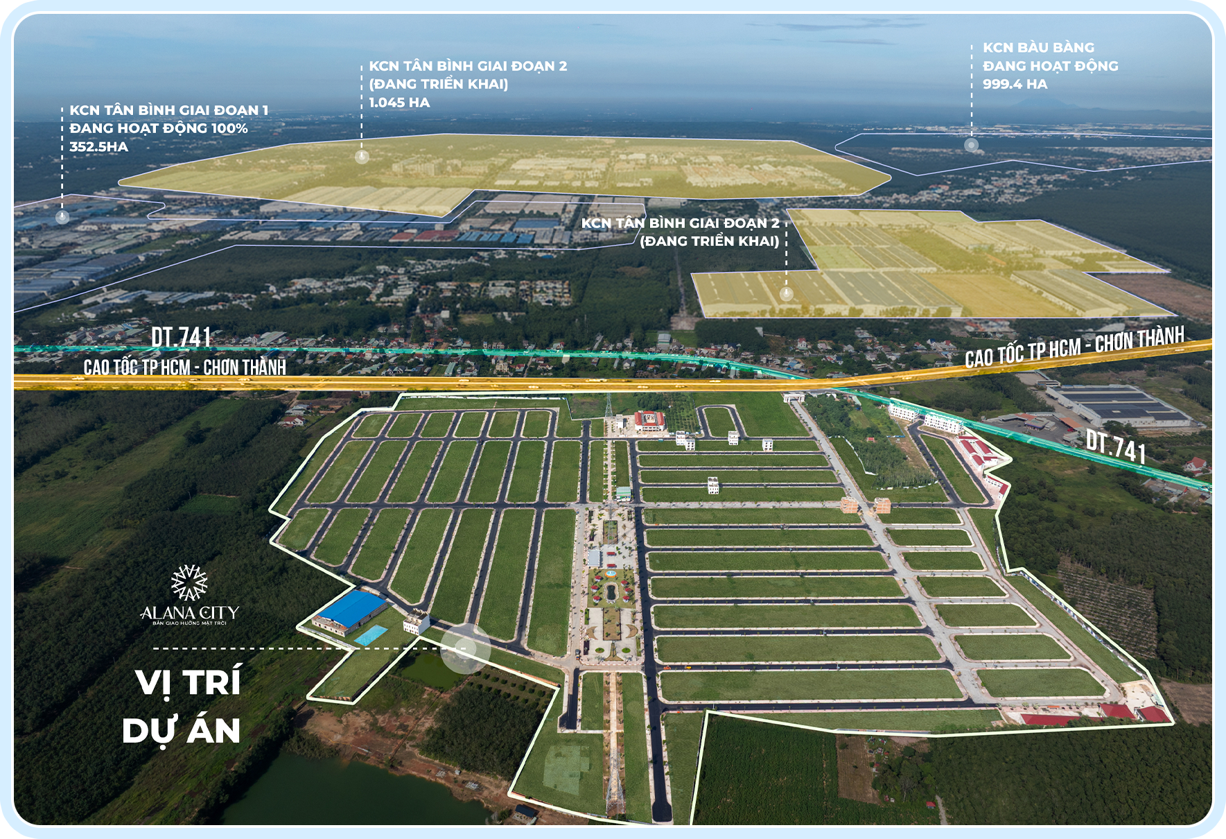 Nằm trên trục ĐT.741 (quy hoạch cao tốc TP.Hồ Chí Minh - Chơn Thành) và nằm giữa đô thị phát triển công nghiệp Đông Bắc TP.HCM
